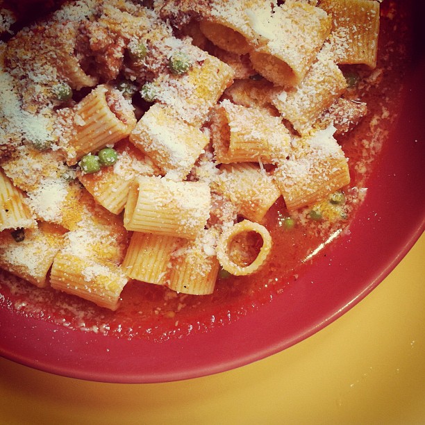 Pasta with spicy sausage and pea