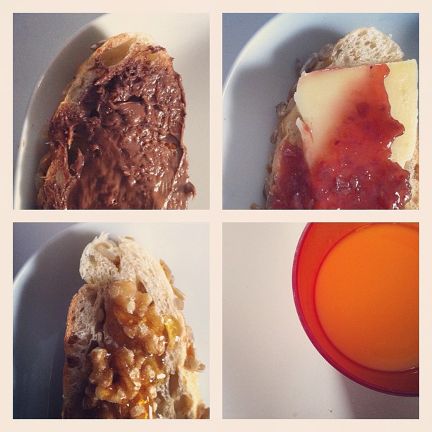 Nutella, cheese and jam, and walnut and honey on bread with orange juice