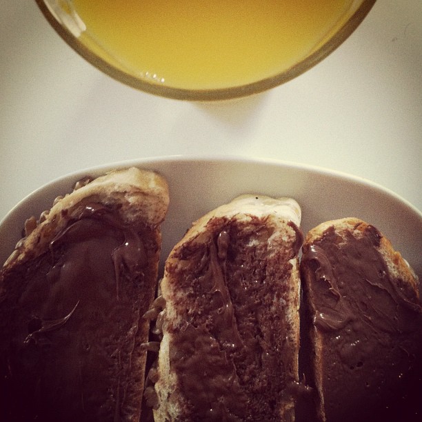 Nutella on seeded bread with orange juice