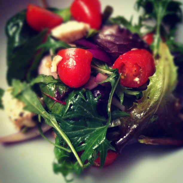 Mozzarella salad with cherry and plum tomatoes, rocket and leafy greens and red onion
