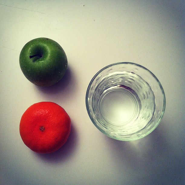Granny smith apple and a satsuma with water