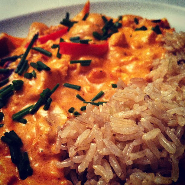 Tofu and mushroom stroganoff with brown long rice