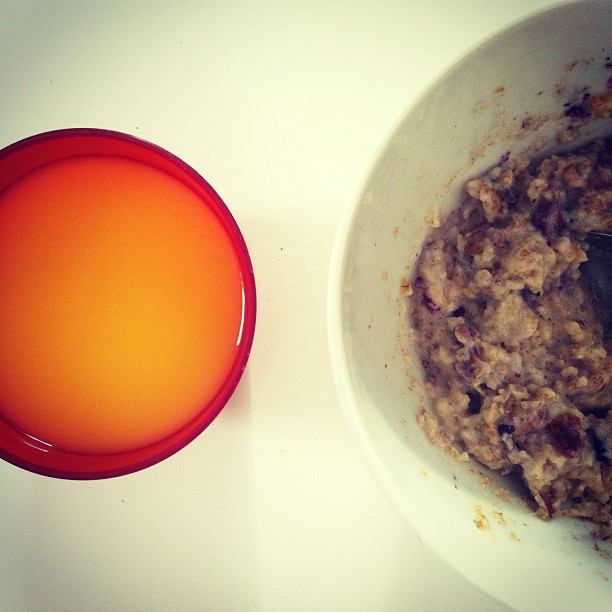 Porridge with blackberries, nuts and orange juice on the side