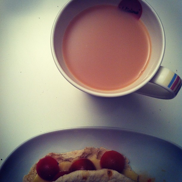 Cheese and cherry tomato in toasted pitta with tea