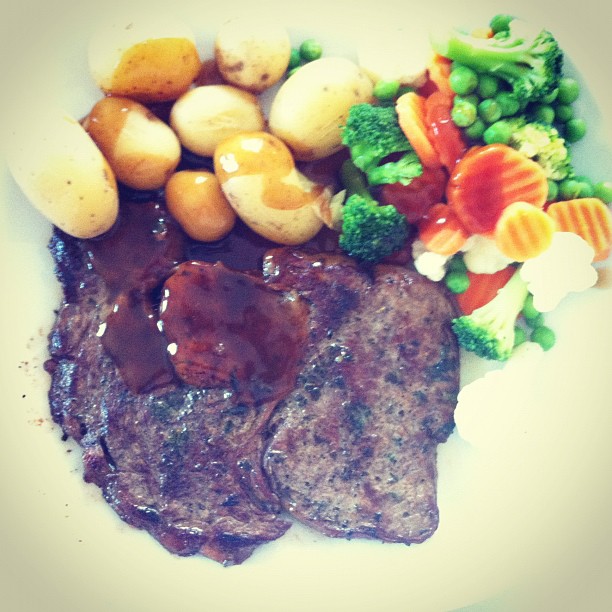 Steak with new potatoes and vegetables
