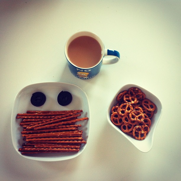 Tea with salted sticks, pretzels and blueberry yo yo