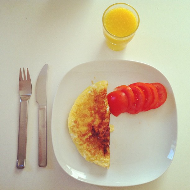 Omelette with freshly cut tomatoes and orange juice