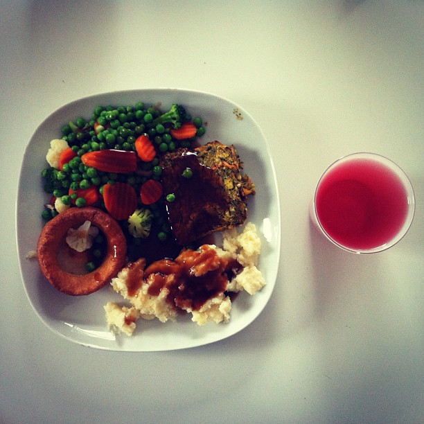 Nut roast with mash, vegetables and Yorkshire pudding along with some Rekorderlig cider