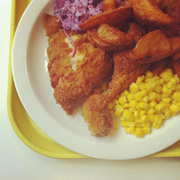 Southern-fried chicken with sweet corn and red cabbage