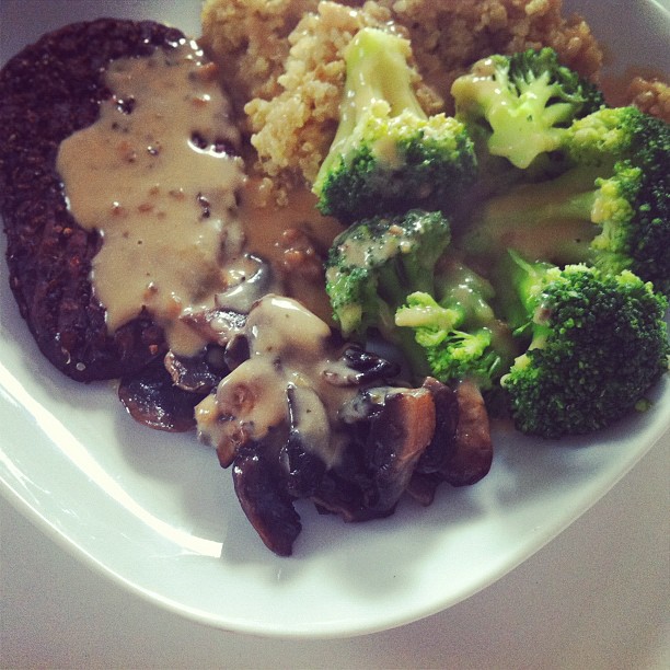 Quorn steak with broccoli, quinoa and mushrooms