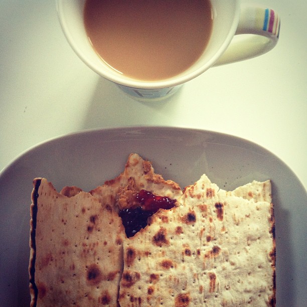 Peanut butter and strawberry jam on toasted flatbread with tea