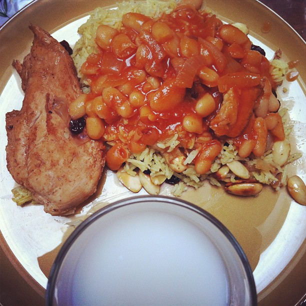 Rice, beans and chicken in tomato sauce with dugh