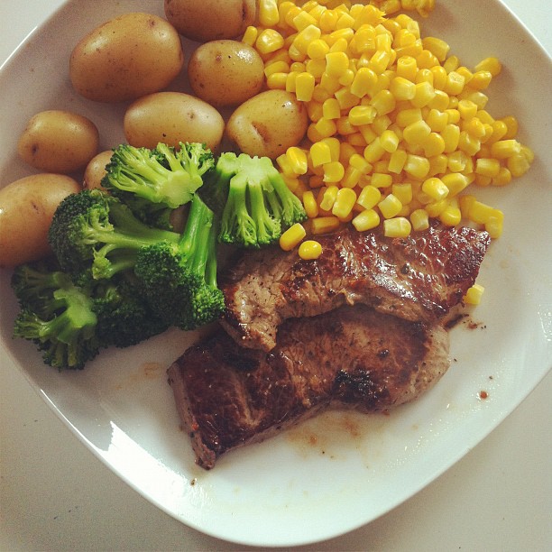 Orgranic rump beef with new potatoes, broccoli and sweetcorn