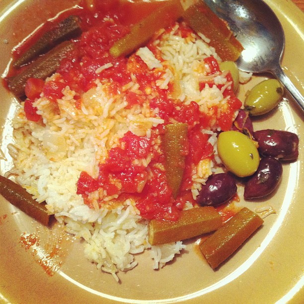 Rice with okra in tomato sauce and olives