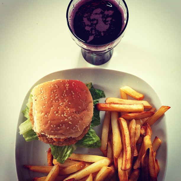 Chicken burger with chips and red grape spritzer