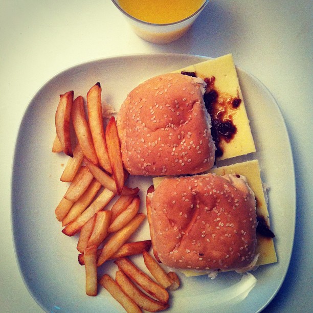 Chips with cheese and caramelised onion with orange juice