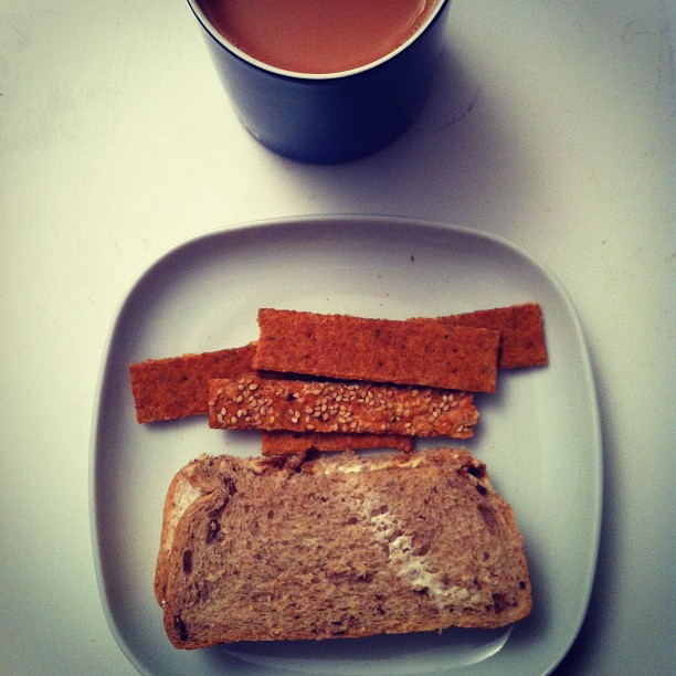 Wholemeal sandwich with philadelphia and caramelised onion with tea and tomato and basil Italian sticks