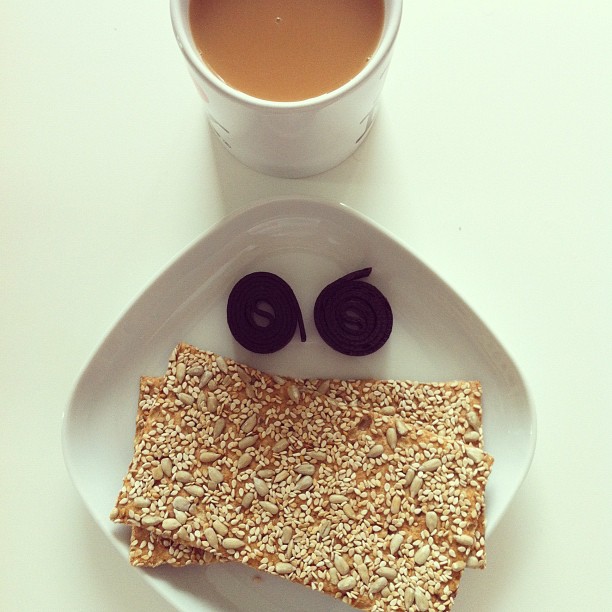 Blueberry yo yos, sunflower and sesame crispbread with earl grey tea and a splash of almond milk