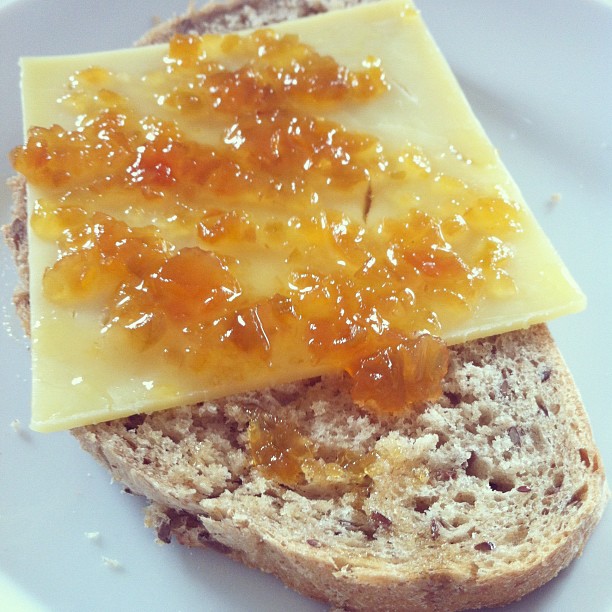 Peach jam on cheese on rye bread