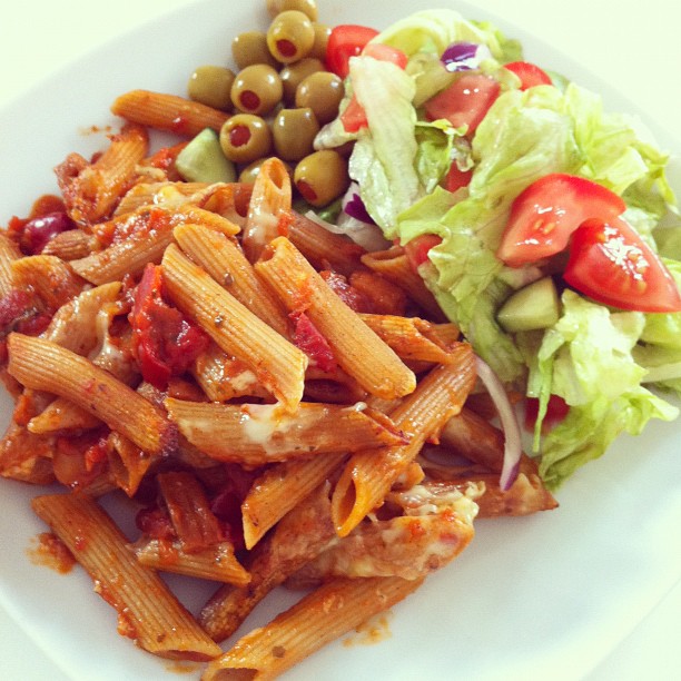 Pasta bake in chargrilled vegetables sauce with salad (balsamic dressing) and olives
