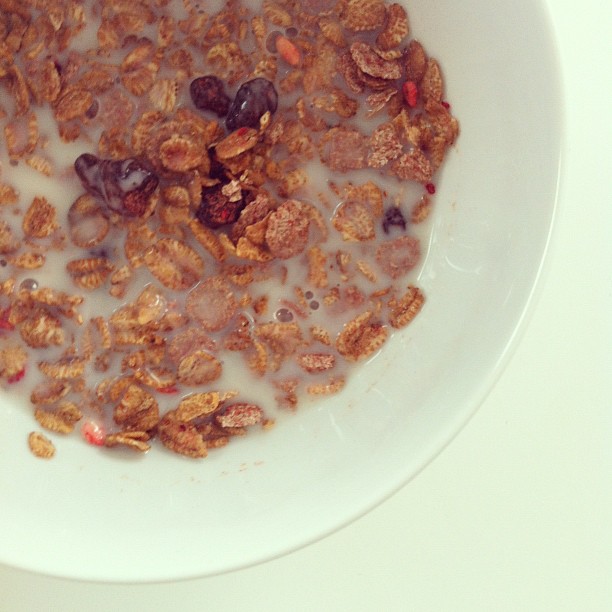 Organic muesli with dried strawberries in almond milk