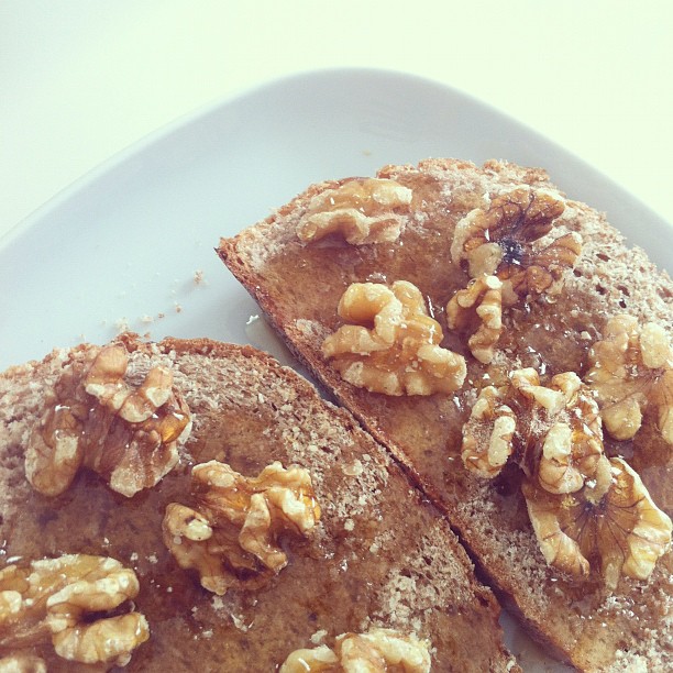 Walnuts and honey on rye bread
