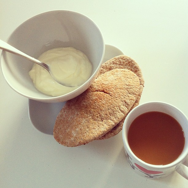 Toasted pitta bread with Greek yogurt and tea