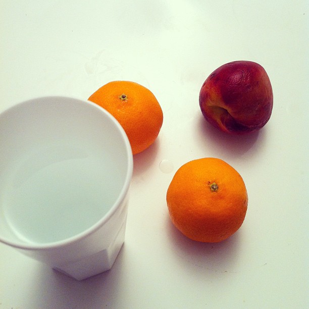 Peach, two satsumas and water