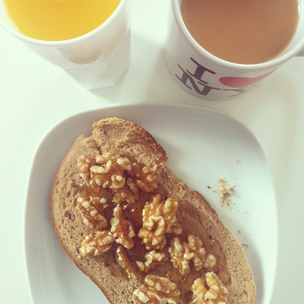 Walnuts and honey on polish sourdough bread with orange juice and tea