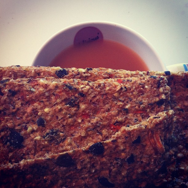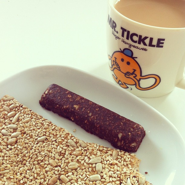 Coco laco nākd bar with sunflower and sesame crispbread and tea