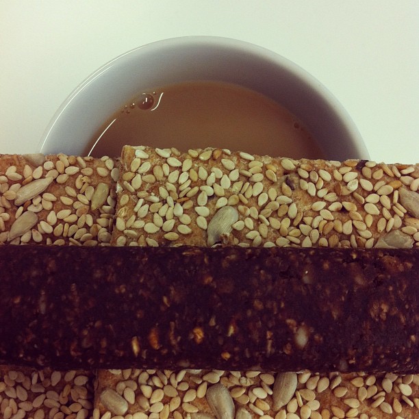Sunflower and sesame crispbread, coco laco nākd bar with tea