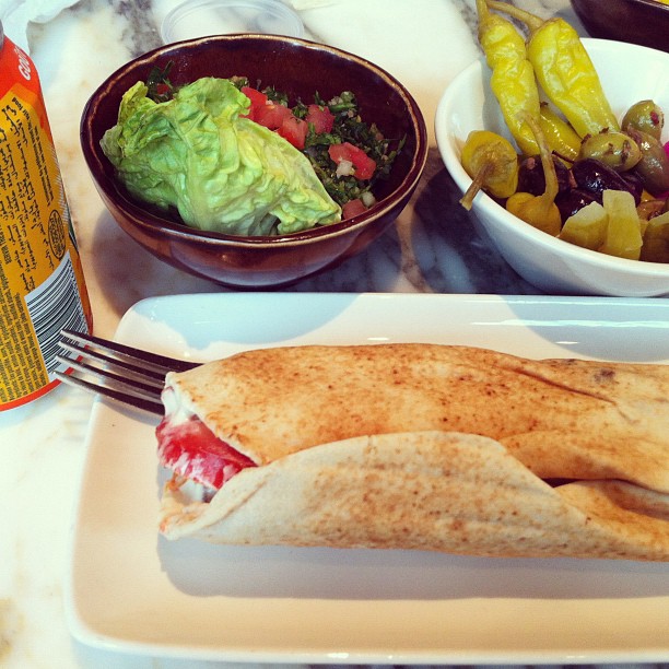 Falafel wrap with tabbouleh and pickles with fizzy orange juice