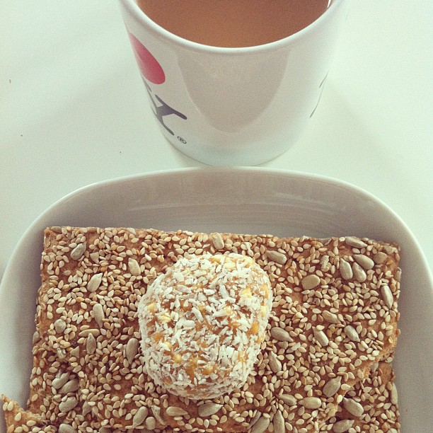 Coconut & macadamia bounce ball with sunflower and sesame seeds crispbread and tea