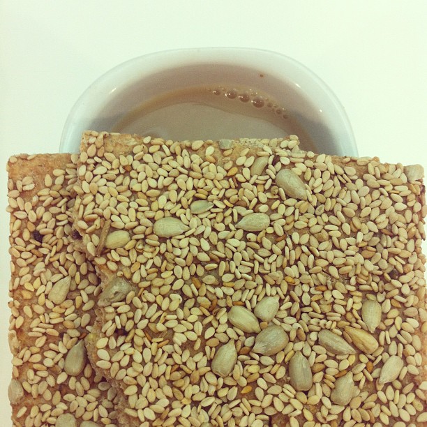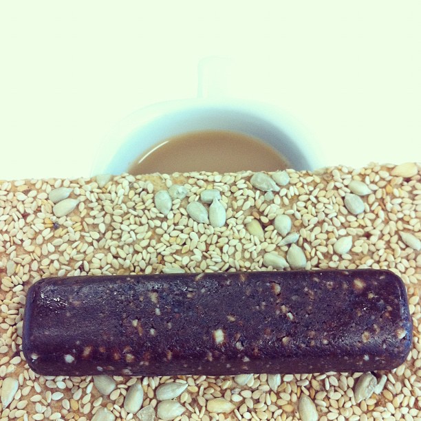 Coca orange nākd bar, sunflower and sesame seeds crispbread and tea
