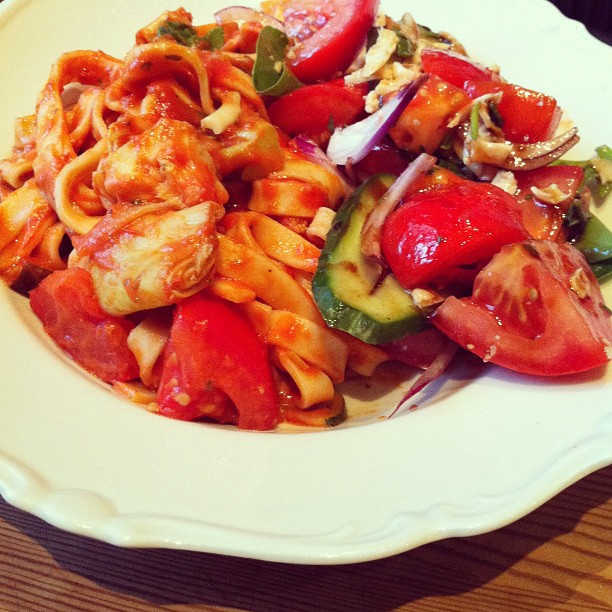 Vegetarian pasta with tomato salad