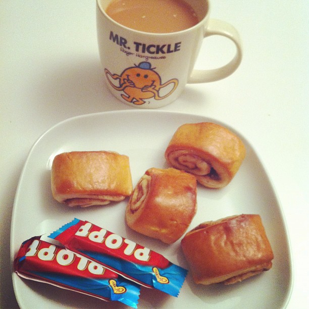 Cinnamon buns, plopp and earl grey tea with organic almond milk