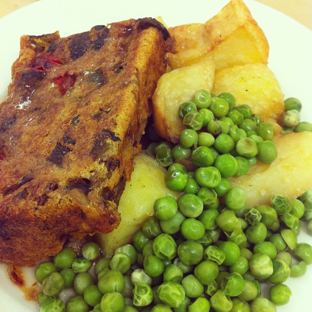 Veggie loaf with roast potatoes and peas
