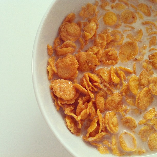 Organic cornflakes in almond milk with whey protein and a dash of agave syrup