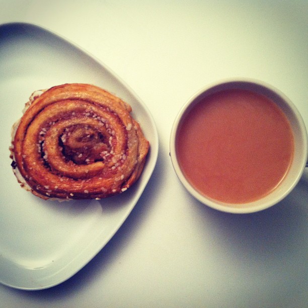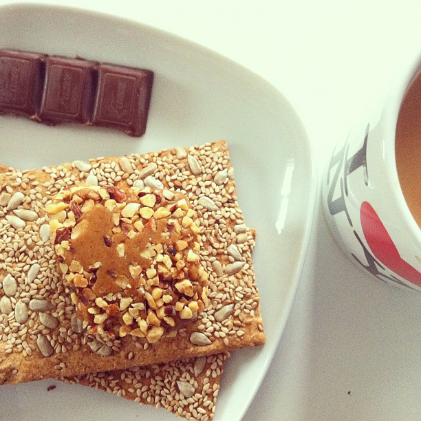 Almond bounce ball, geisha chocolate, sunflower and sesame crispbread with english breakfast tea in organic almond milk