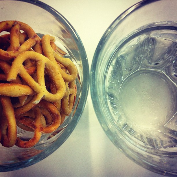 Sour cream and chive pretzels with water