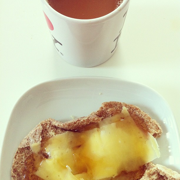 Cheese and honey in pitta bread, with English new tea in organic almond milk
