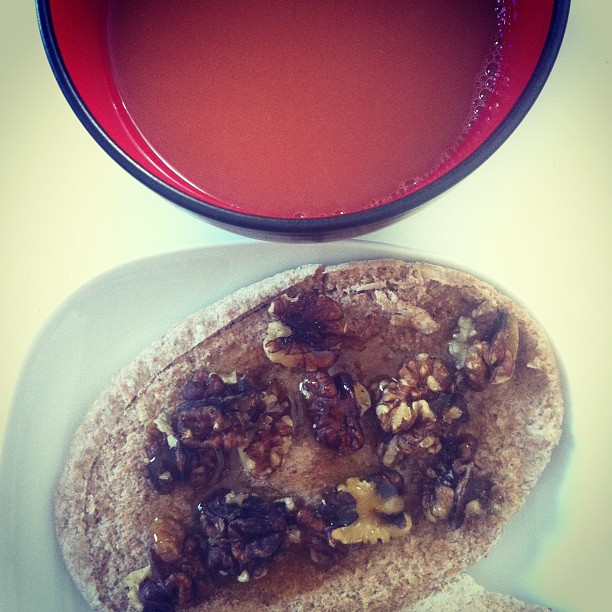 Tea with walnuts and honey on pitta bread