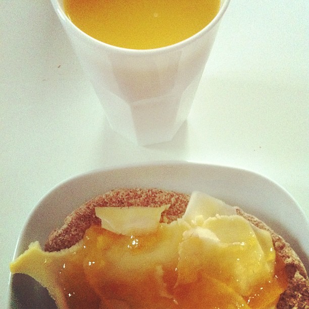 Apricot and cheese on toasted pitta with orange juice