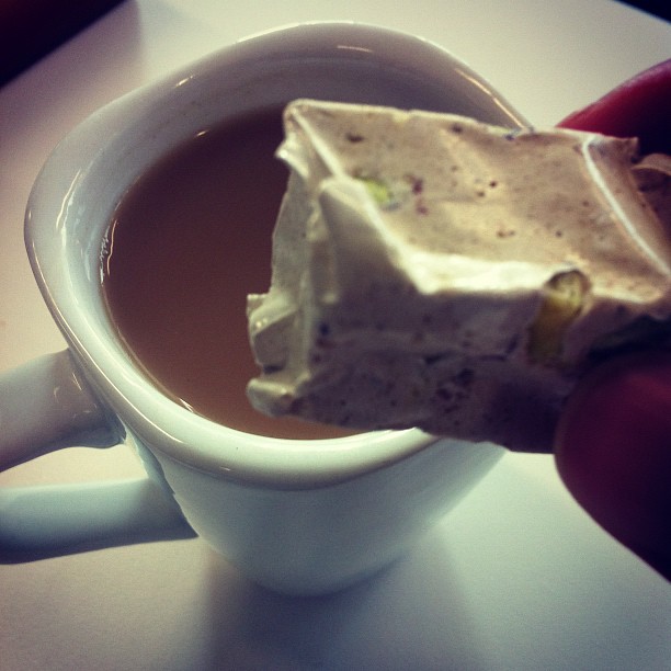Tea with tomato and basil italia sticks and nougat