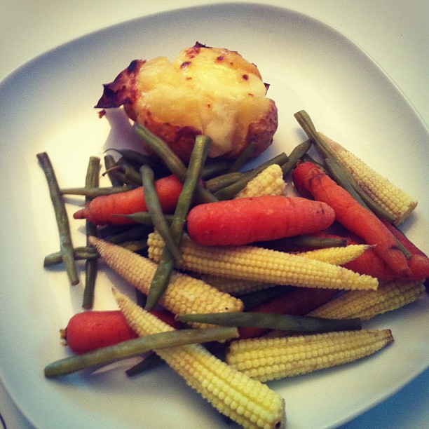 Steamed vegetables and jacket potato with cheese