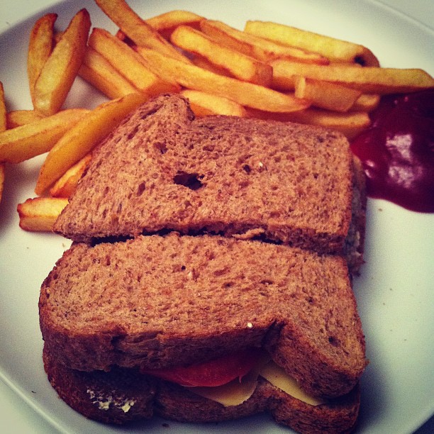 Cheese and tomato sandwich with chips