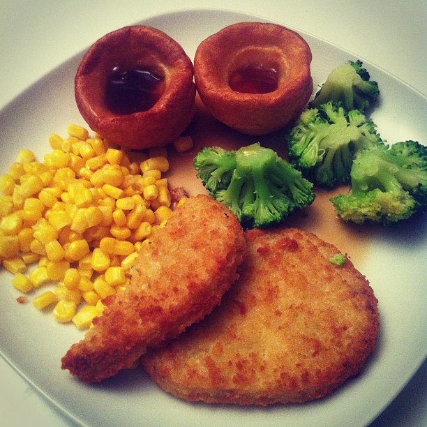 Cauliflower and cheese grill with sweetcorn, broccoli and Yorkshire pudding