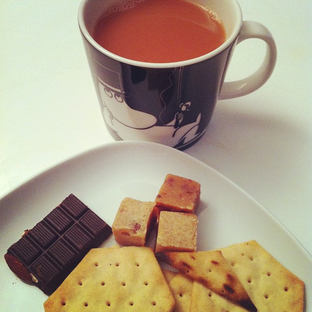 Tea with coconut and cherry fudge, organic almond chocolate and cheese crackers
