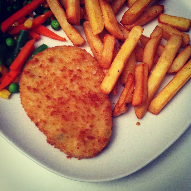 Cauliflower cheese grill with chips and vegetables