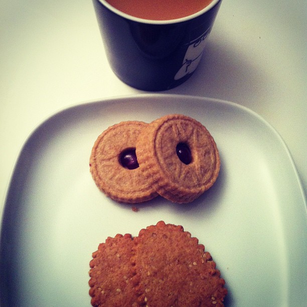 Darjeeling earl grey tea with jammy wheel and wholemeal biscuit
